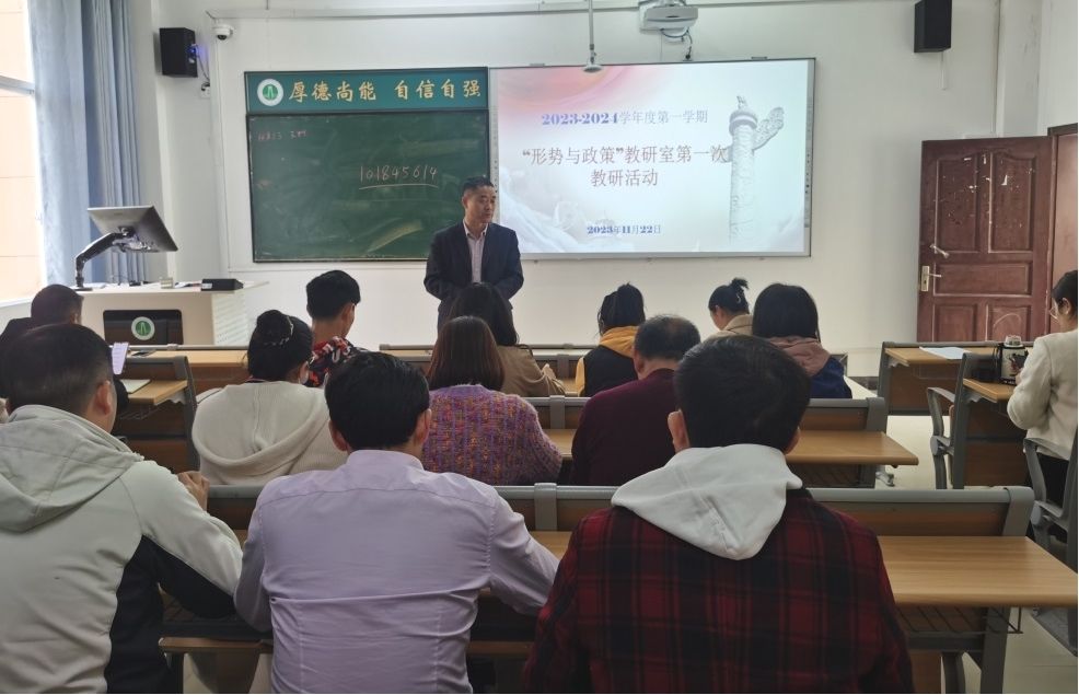 2023年11月22日下午三点,beat365平台官方网站“形势与政策”教研室召集学校所有兼课教师在文A401教室开展本学期第一次教研活动。首先,“形势与政策”教研室主任常卫峰介绍形势与政策课的课程情况、学习通平台的使用情况、上课注意事项及此门课如何考核等;其次,答疑解惑,兼课教师特别是初次带这门课的教师存在的疑问现场沟通交流;再次,传达咸宁职院首届思政课教师教学基本功比赛事宜;最后,beat365平台官方网站院长兼书记龚斌安讲话。龚院长从政治纪律、教学纪律、意识形态、马院做好服务工作等方面对党政干部和辅导员及教研室提出要求;大家纷纷表示要按照要求上好此门课。行政处室干部、院部书记、副书记、辅导员等30多人参加了此次活动。
