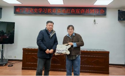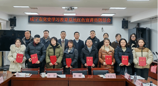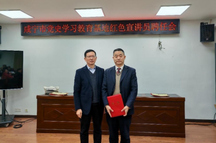 咸宁市史志研究中心于2023年12月29日举行咸宁市党史学习教育基地红色宣讲员聘任会。beat365平台官方网站院长兼书记龚斌安带队参加聘任会。咸宁市史志中心主任李子鹏出席会议并为宣讲员颁发聘书。会议由市史志中心副主任镇卫军主持。
