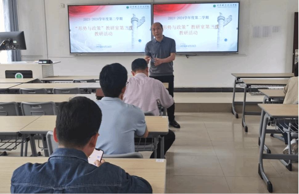 常卫峰首先向教师们介绍了形势与政策课的课程建设和学习通平台使用情况,教学注意事项及“形势与政策”课考核要求等;教务科科长解维娟从课程安排、教学纪律、教学资料收集、考试(补考)等方面做了详细阐释;教学副院长王翔从课程内容方面、注意政策性和针对性等方面提出具体要求。