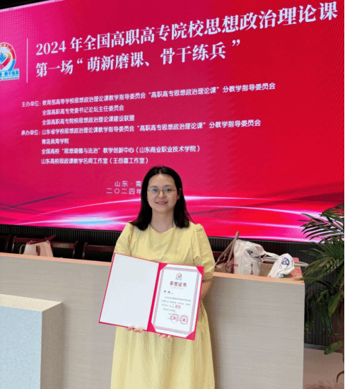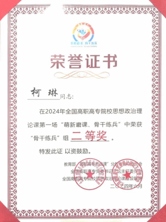 6月22日,2024年全国高职高专院校思想政治理论课第一场“萌新磨课、骨干练兵”活动在山东圆满落下帷幕。经过激烈角逐,beat365官网思政课教师柯琳荣获“骨干练兵”组二等奖。展示了beat365官网思政课教师扎实教学能力,是学校落实立德树人根本任务、推进思政课高质量发展的一项成果。