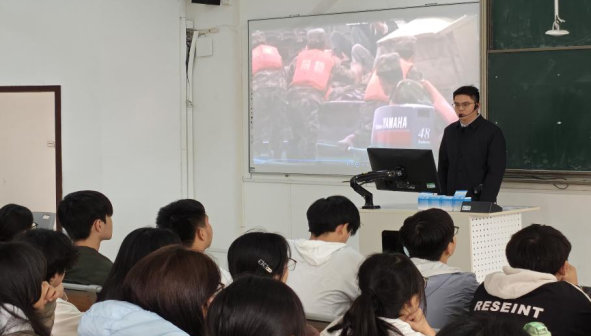 刘彪以"风雨中的生命壮歌"为题,深情讲述了抗洪抢险中跨越时空的英雄故事。英雄们用"每一袋沙袋都承载着守护家园的决心,每一道身影都凝聚着江淮儿女众志成城的力量"的生动描述,将"万众一心、众志成城,不怕困难、顽强拼搏,坚韧不拔、敢于胜利"的抗洪精神与烈士精神诠释得淋漓尽致,让滚烫的信仰力量直抵人心。冲锋在前的英雄们以血肉之躯筑起生命防线,汛情是无声的命令,防汛就是沉甸甸的责任。呼吁学子们用生命点亮生命,“照亮英雄来时路,温暖后人前景中!”