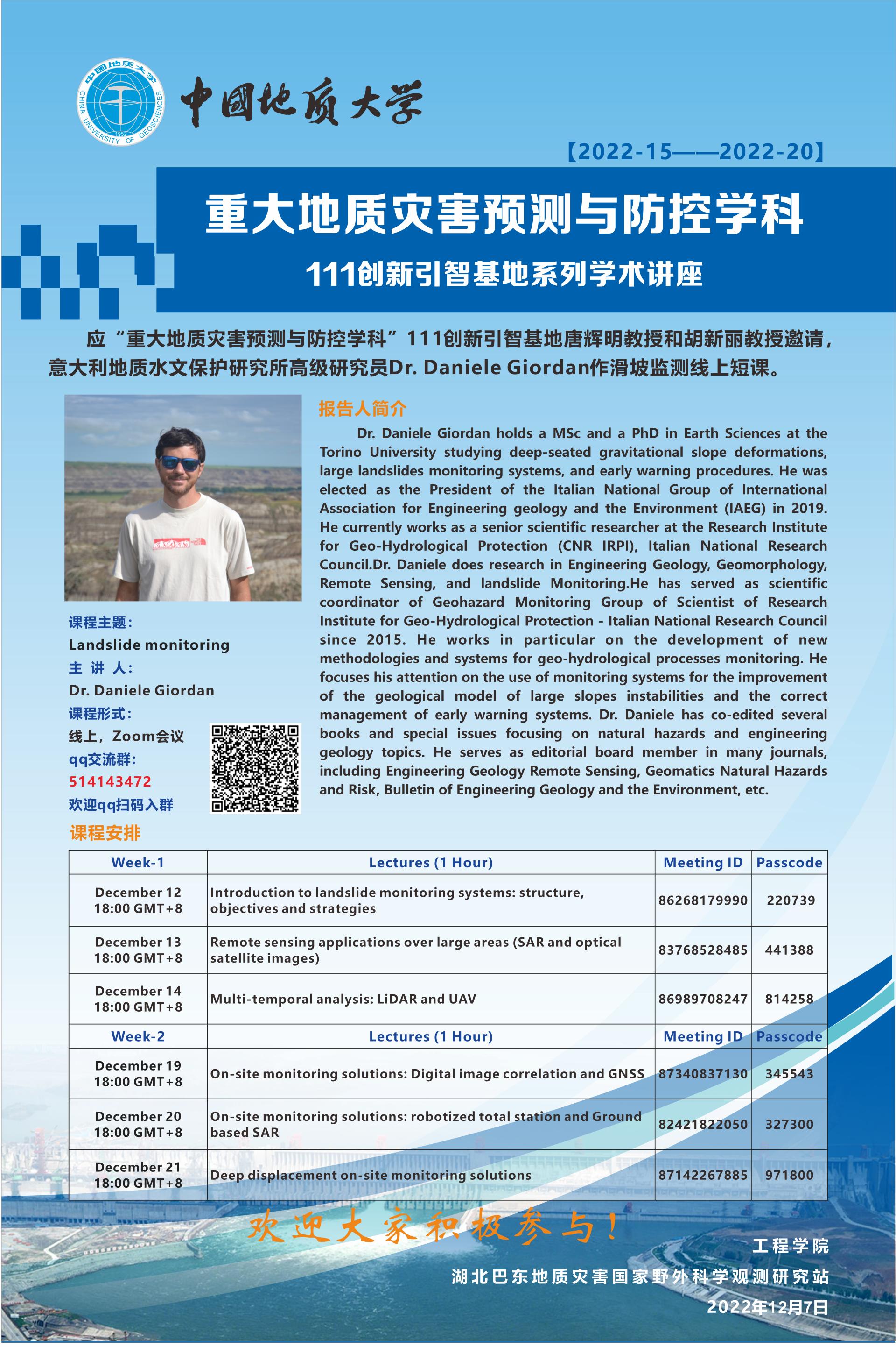 重大地质灾害预测与防控学科---111创新引智基地系列学术讲座Dr. Daniele Giordan作滑坡监测线上短课