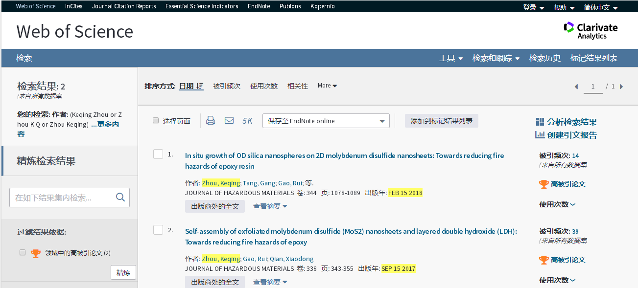 基本科学指标数据库(Essential Science Indicators,简称ESI)最新数据显示,安全工程系周克清老师发表的论文“In situ growth of 0D silica nanospheres on 2D molybdenum disulfide nanosheets: Towards reducing fire hazards of epoxy resin”入选高被引论文。该论文是周克清老师以WilliamHill官方网站(武汉)WilliamHill官方网站为第一单位、第一作者和通讯作者身份发表的第2篇ESI高被引论文。2018年7月周克清老师发表的论文“Self-assembly of exfoliated molybdenum disulfide (MoS2) nanosheets and layered double hydroxide (LDH): Towards reducing fire hazards of epoxy”曾同时入选ESI高被引论文和热点论文。
