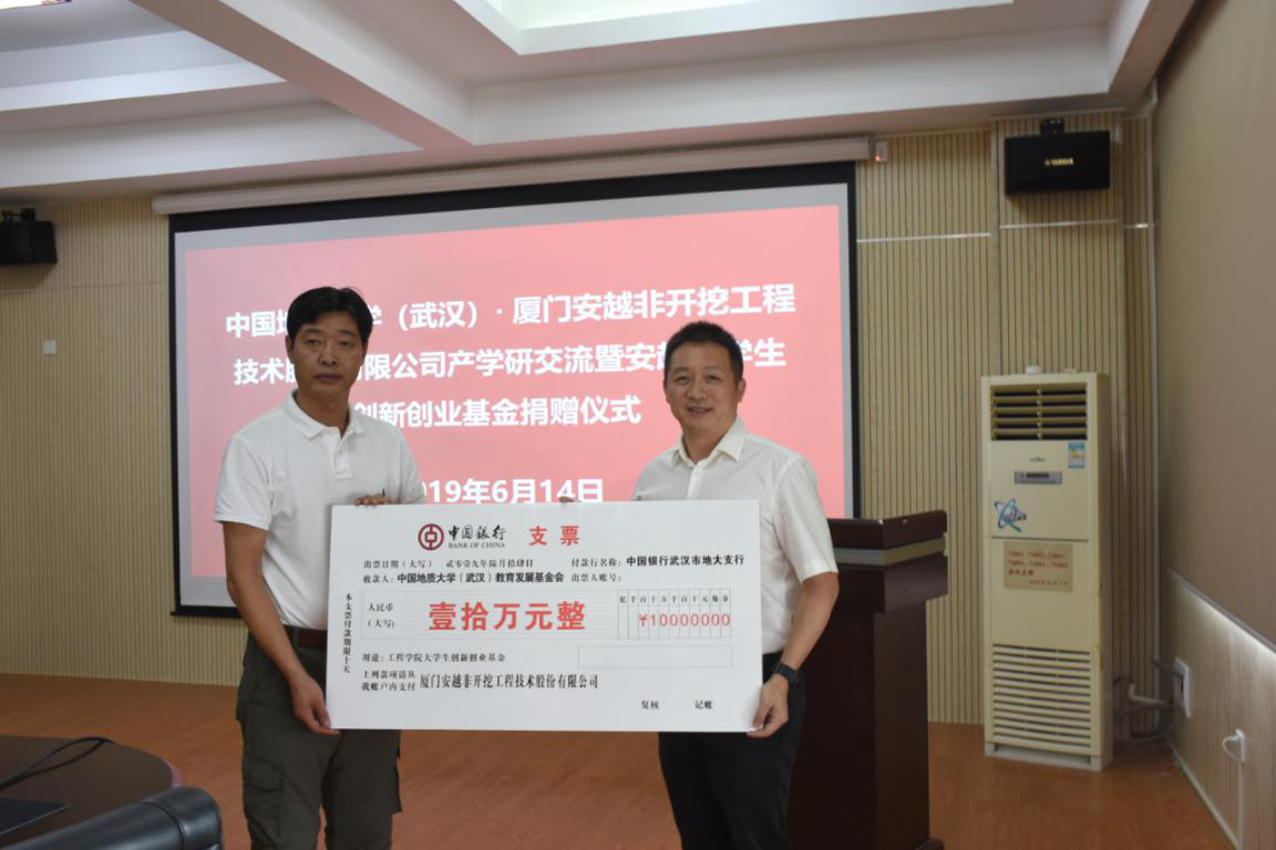 2019年6月14日上午,厦门安越非开挖技术股份有限公司来校作产学研交流,并捐赠10万设立安越大学生创新创业基金,捐赠仪式在315举行。厦门安越非开挖技术股份有限公司董事长廖宝勇一行、武汉中地大非开挖研究院有限公司总经理孔耀祖,校友工作与教育基金管理处副处长吕占峰、丁苗苗,WilliamHill官方网站党委书记陈飞、党委副书记江广长、副教授曾聪参加会议。江广长主持会议。