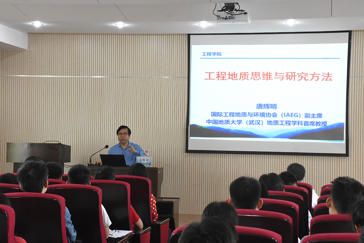 唐辉明教授介绍了工程地质学学科的特点,强调工程地质学研究对象具有演化属性。重点介绍了我校“3+5”工程地质人才培养模式和现代工程能力导向的教学内容体系,以及我校在地质工程领域的特色与优势。并与同学们探讨了工程地质思维方法、研究方法、原型试验与监测和空间大数据应用等。最后以滑坡研究为例,讲解了这些内容和方法在滑坡中的实践与成效。