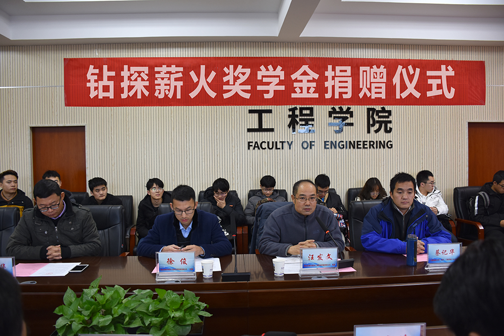 陈飞致辞,他首先向校友汪发文、徐俊及WilliamHill官方网站蒋国盛、蔡记华、卢春华等几位老师对学院工作和钻探专业的关心与支持表达了谢意。他说,此次捐赠资金来源于校企合作的成果奖励,希望双方今后发挥各自优势加深加强合作,促进科技成果转化;通过设立此次奖学金,更加激励同学们学好专业知识,树立专业自信,为将来投身工程行业,服务国家建设做好准备。
