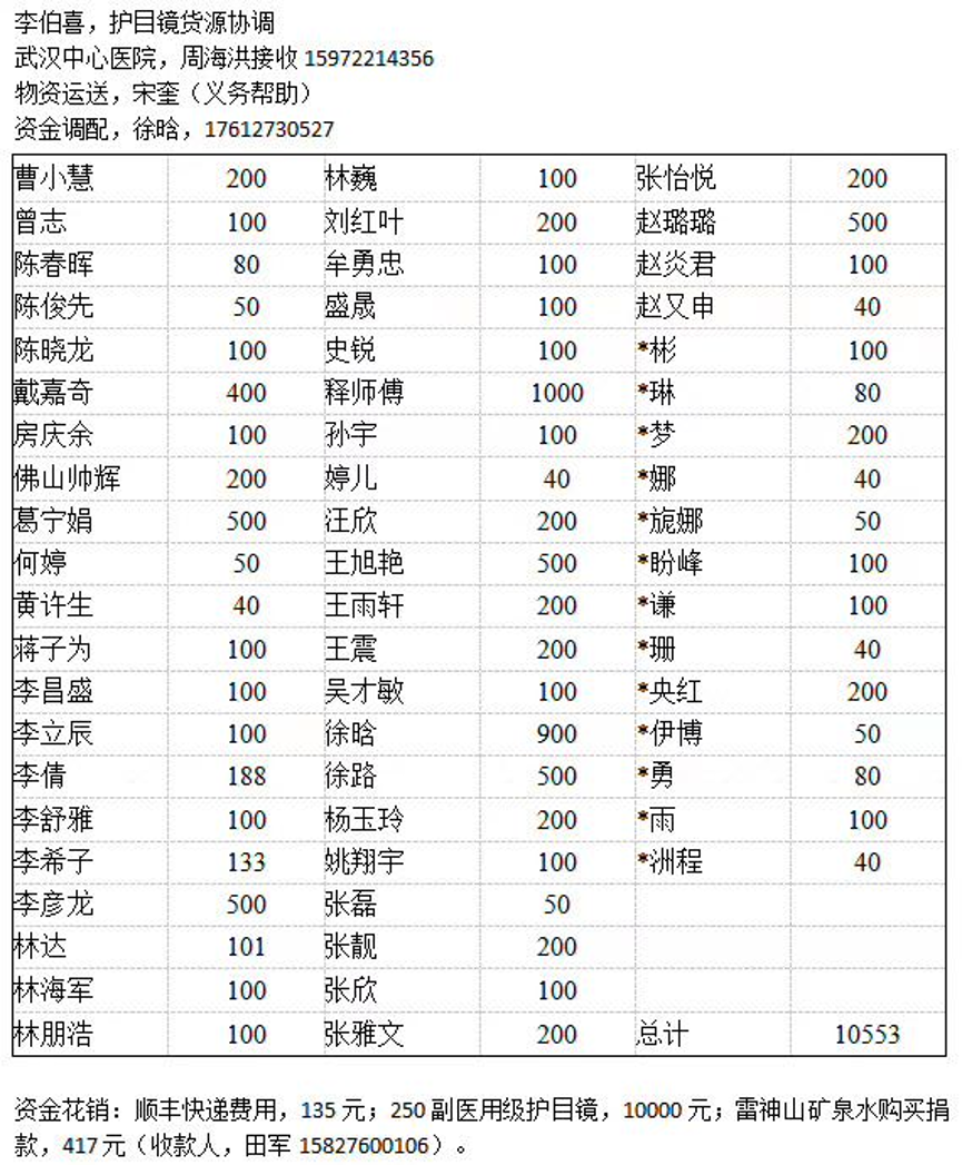 徐晗博士:首先不管别人捐了多少,只要捐了的就是很给力的事情。我提一个建议,我也看到我们学院有些人在搞募捐的事情,我建议如果可以捐物资就尽量捐物资,因为物资才是最紧缺的。如果说要捐赠医疗物资的话,你们可以去找医院的公示信息,像中心医院或者协和医院缺什么物资他们会公示出来,就比如说缺N95型口罩和防护服,他们会把他们缺的是什么类型的写出来,还有他们医院的接收人的联系方式。