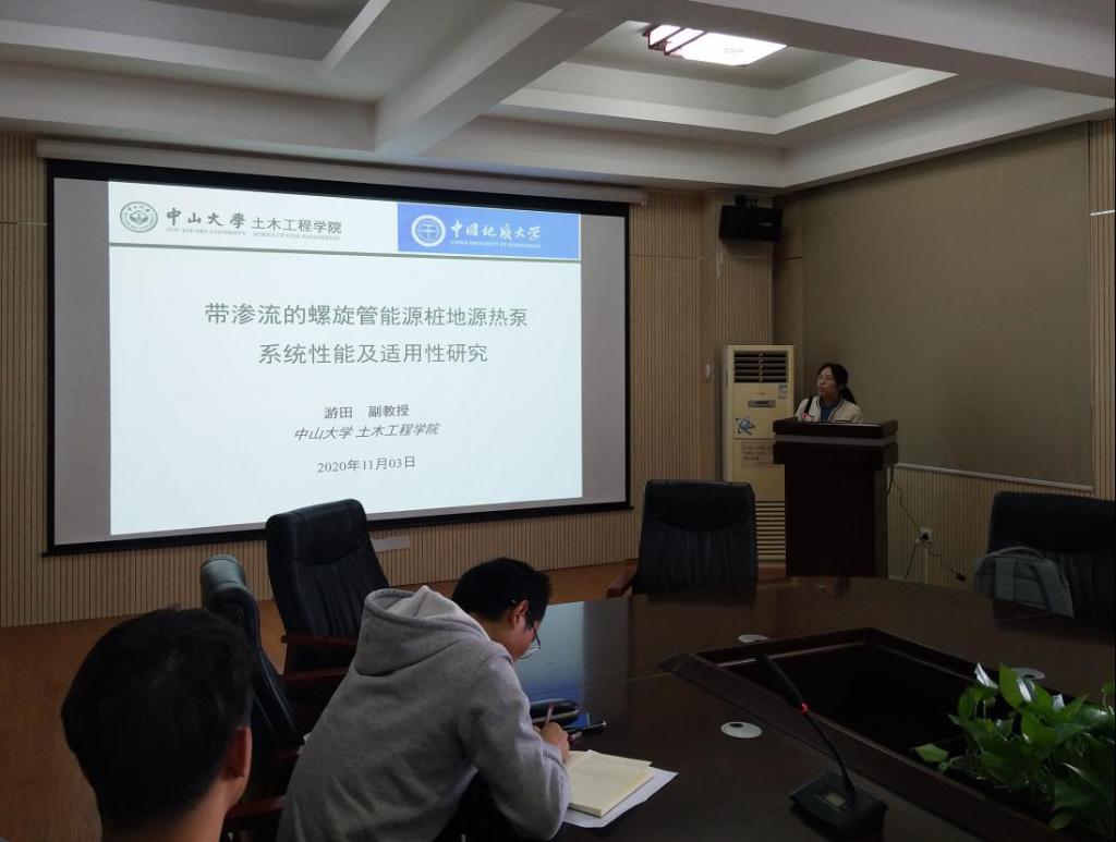 游田副教授详细介绍了区别于地埋管的能源桩三维传热模型,从桩群模型、热泵机组模型、水泵模型和建筑模型四个角度展开介绍,并采用自主研发的软件“能源桩之星”(EP-Star)分析了地下渗流、桩群结构等因素作用下螺旋管能源桩的动态传热机理,对带渗流的螺旋管能源桩地源热泵系统在北方典型气候区(沈阳、长春等)的适用性进行评价。游田副教授讲授深入浅出,对WilliamHill官网师生的踊跃提问给予了悉心解答,在座师生受益匪浅。