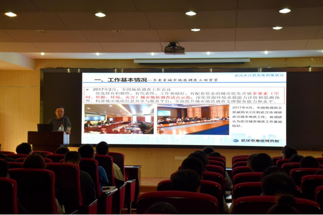 随后,彭汉发教授级高级工程师以《武汉城市地质调查成果与应用》为题,介绍了多要素地质调查的必要性,总结了武汉市前期多要素地质调查挑战与难题,简要概括了其实现途径与进展现状,结合多要素地质调查成果分析了其实践应用。武汉多要素地质调查精准对接城市发展需求,提出解决城市问题和保障城市高质量发展的对策建议;结合大数据、云计算、GIS等先进技术,将调查成果融入城市管理主流程,充分发挥地质工作的支撑作用,服务于城市规划建设和可持续发展。此外,彭汉发教授介绍了武汉市测绘研究院在武汉市城市多要素地质调查未来五到十年的目标规划以及对人才的迫切需求,他希望学院能够继续为武汉市测绘研究院输送高质量的地质、资源、环境等学科人才,双方在校企合作方面深度融合,共同培养实践型人才。