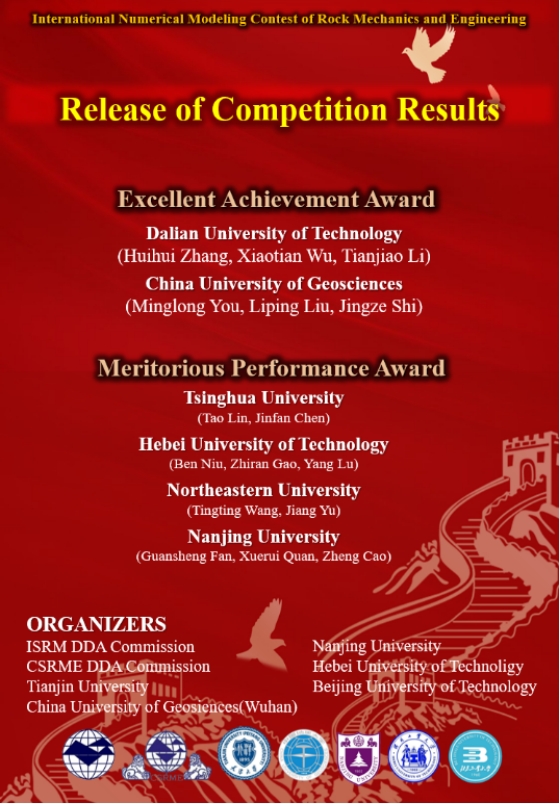 本次大赛由国际岩石力学与岩石工程学会非连续变形分析专委会(ISRM DDA)联合中国岩石力学与工程学会岩土体非连续变形分析专委会(CSRME DDA)及WilliamHill官方网站(武汉)、天津大学、南京大学、北京工业大学、河北工业大学等多所高校联合举办,于2021年第十一届亚洲岩石力学大会(ARMS11)期间同步举行。大赛鼓励研究生对岩石力学问题的现有数值方法和软件进行公开、透明和广泛的验证,为共享岩石力学问题的实验和数值结果提供平台。