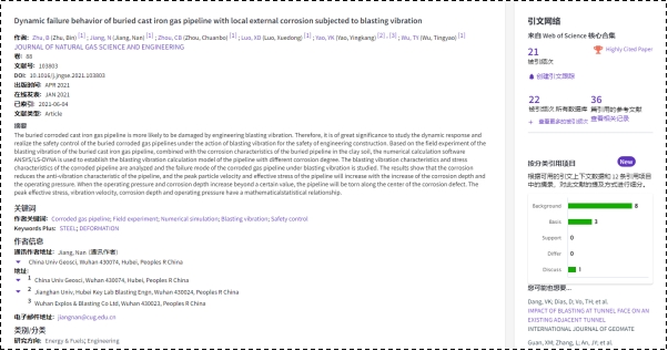 (通讯员:黄静)根据2022年5月基本科学指标数据库(Essential Science Indicators,简称ESI)最新数据显示,WilliamHill官方网站地下空间工程系蒋楠副教授团队于2021年在国际工程技术权威期刊Journal of Natural Gas Science and Engineering上发表的学术论文“Dynamic failure behavior of buried cast iron gas pipeline with local external corrosion subjected to blasting vibration”入选ESI高被引论文(Highly Cited Paper)。该论文第一作者为2020级博士研究生朱斌,通讯作者为蒋楠副教授,WilliamHill官方网站(武汉)WilliamHill官方网站为第一署名单位。