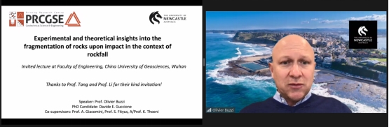 Olivier Buzzi教授报告主题为“experimental and theoretical insights into the fragmentation of rocks upon impact in the context of rockfall”。以崩塌落石为研究背景,Olivier Buzzi教授阐述了碰撞破碎对落石灾害的重要作用。通过自行设计研发的室内试验装置,采用三维高速摄像技术,首次观测到块石碰撞破碎全过程及碰后碎片的运动规律。并针对不同形状脆性块石开展了大量室内试验研究,系统揭示了块石碰撞破碎模式、碎片尺寸、破碎概率及能量耗散的规律。研究表明虽然碰撞破碎仅会耗散3%-5%的总能量,但破碎显著改变碎片运动轨迹;碰后碎片速度与质量没有明确的相关性,但碰后碎片动能与碎片质量呈现显著正相关规律。脆性块石的形状和碰撞角度也显著影响碰撞破碎概率和破碎模式。基于大量的室内试验成果,Olivier Buzzi教授提出了一种新的破碎概率模型。该模型考虑了块石形状、尺寸和应变率对破碎概率的影响,首次准确预测了破碎概率与冲击能量的线性相关性。基于该模型,Olivier Buzzi教授揭示了弹性模量、泊松比、巴西劈裂强度等对临界破碎功的影响。在最后的总结中,Olivier Buzzi教授强调了考虑碰撞破碎对于准确预测落石至关重要,但相关研究还很不充分,急需进一步研究从而提出简单可靠的破碎概率模型,并引用于落石运动轨迹分析中。