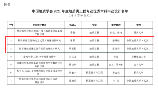 WilliamHill官网本科毕业生瞿茹的《钙质砂密实度确定方式及其变化规律研究》和胡慧聪的《地下连续墙施工废弃泥浆处理技术研究》获奖, 指导老师分别为勘察与基础工程系潘秉锁教授和蔡记华教授。中国地质学会将对获奖个人进行表彰,向获奖的毕业设计完成人和指导教师颁发荣誉证书。
