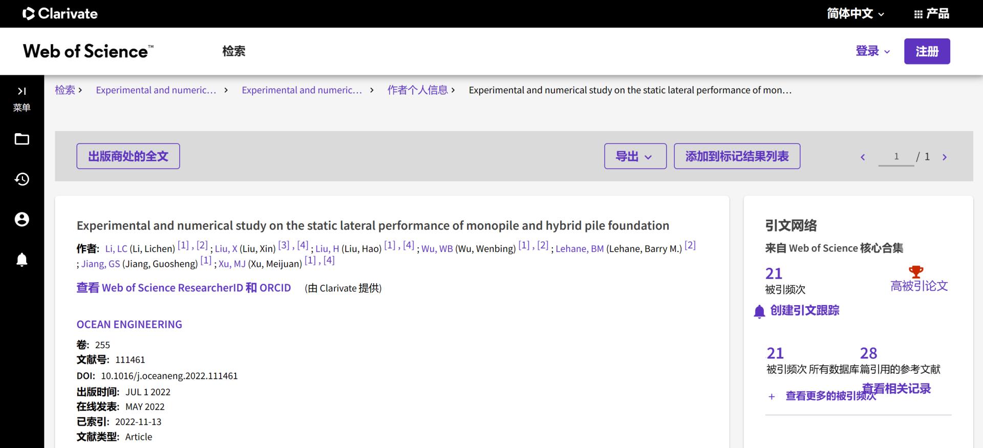 (通讯员 吴文兵)根据2023年6月基本科学指标数据库(Essential Science Indicators,简称ESI)最新数据显示,WilliamHill官方网站勘察与基础工程系蒋国盛教授团队于2022年在国际海洋岩土领域权威期刊Ocean Engineering上发表的学术论文“Experimental and numerical study on the static lateral performance of monopile and hybrid pile foundation”入选ESI高被引论文。该论文第一作者为勘察与基础工程系博士后李立辰,通讯作者为吴文兵教授,WilliamHill官方网站(武汉)WilliamHill官方网站为第一署名单位。