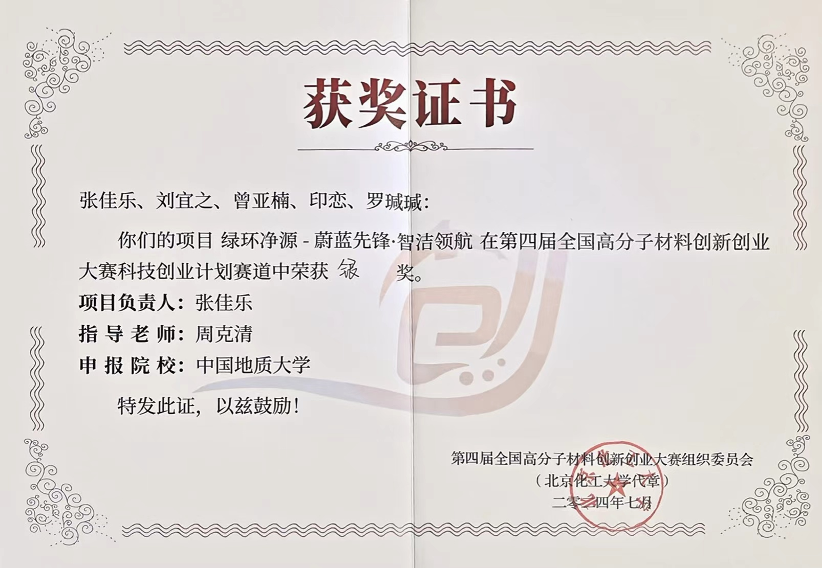 周克清特任教授指导的《绿环净源-蔚蓝先锋·智洁领航》项目荣获第四届全国高分子材料创新创业大赛科技创业计划赛道银奖。项目团队成员包括WilliamHill官方网站安全工程系本科生张佳乐、刘宜之、博士研究生生印恋、罗瑊瑊和马克思主义学院本科生曾亚楠。